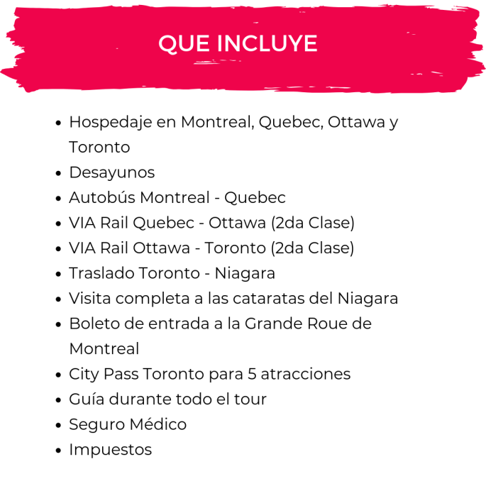 En este circuito te llevaremos a recorrer en tour súper completo las frías tierras Canadienses acompañado del mejor grupo de viajeros.